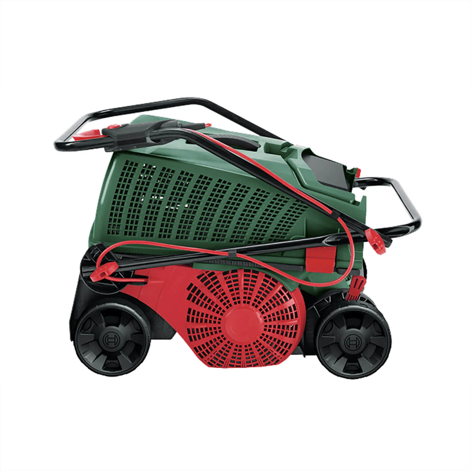 The Bosch Lawn Rake UniversalRake 900 has a high power motor of 900W and a “Jet-Collect System” that has double-spring steel tines for effective moss and thatch removal. The special airflow inlets allow for full filling of the 50l collection box. This collection box is stackable which, along with the double-fold handles, means it can be compactly stored away.