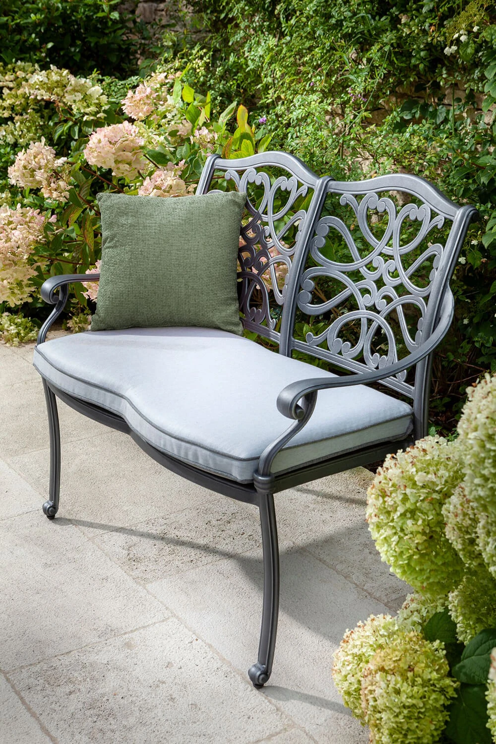 Made from cast aluminium, this garden bench is sturdy and can be left out in the elements without any fear of rusting or deterioration. It has been topped with a comfortable and equally hard-wearing Weatherready cushion which can be left in place all summer – even during poor weather – thanks to its clever design.