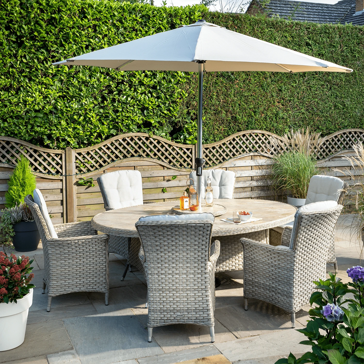Sit down to fabulous meals with family and friends on this gorgeous Hartman Heritage Tuscan 6 Seater Elliptical Dining Set. This stunning set consists of a ceramic glass-topped oval dining table that features a lazy susan, making it easy to pass snacks, sauces and anything else around the table. The set also comes with a luxury round 3m parasol and base.