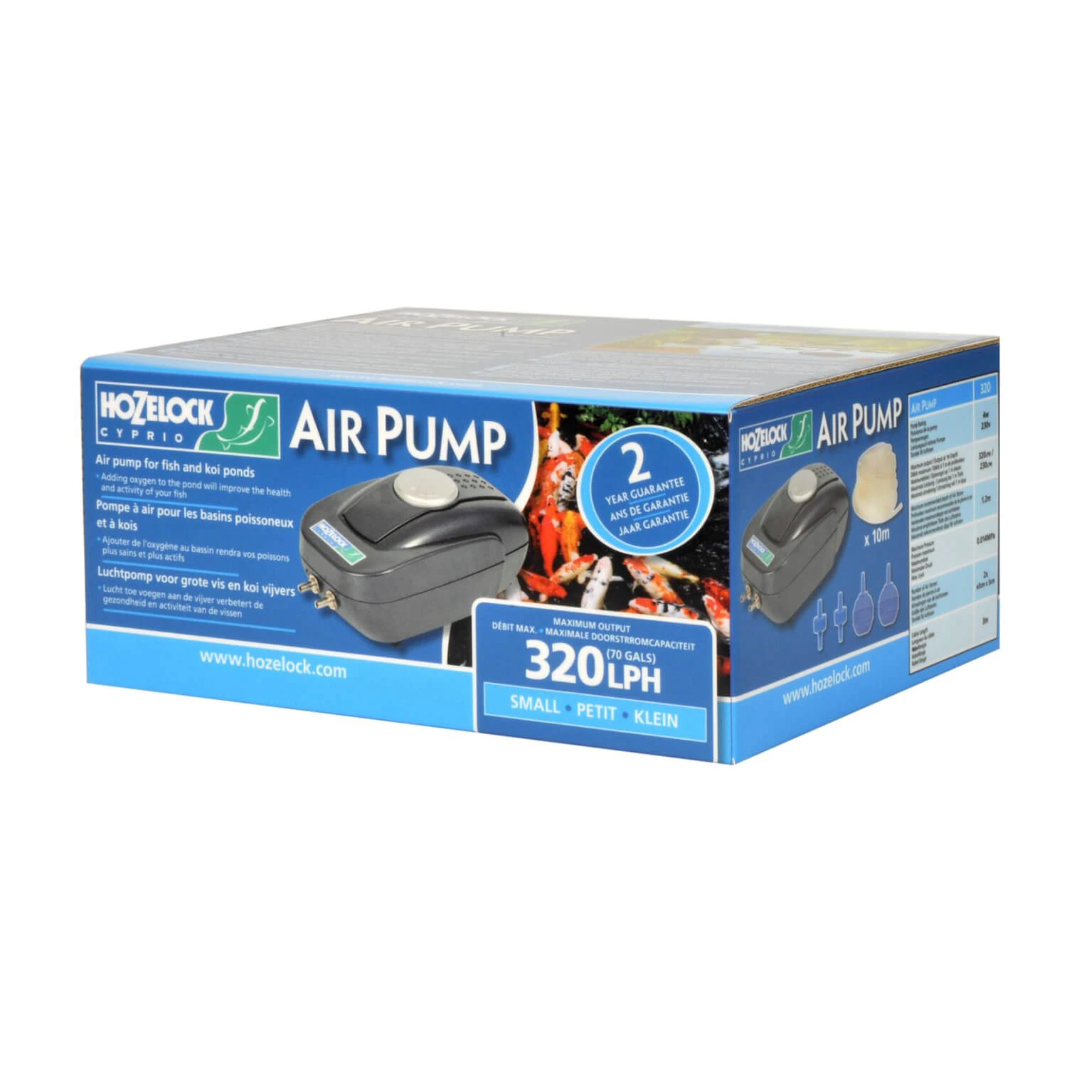 High performance, reliable air pump for small fish and koi ponds. Max output of 320 litres per hour.