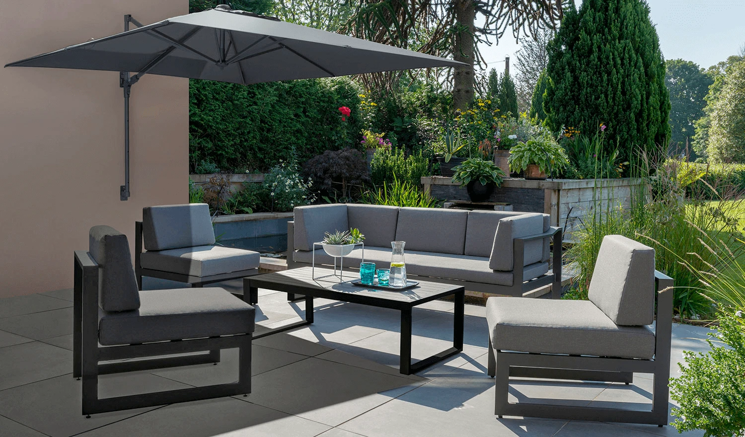 The wind-up mechanism makes it effortless to open and close the canopy, which is made with a lightweight and durable polyester. It is fully adjustable and can tilt vertically to completely cover the furniture from the sun. The hard-wearing canopy offers UV50+ sun protection and is shower resistant.