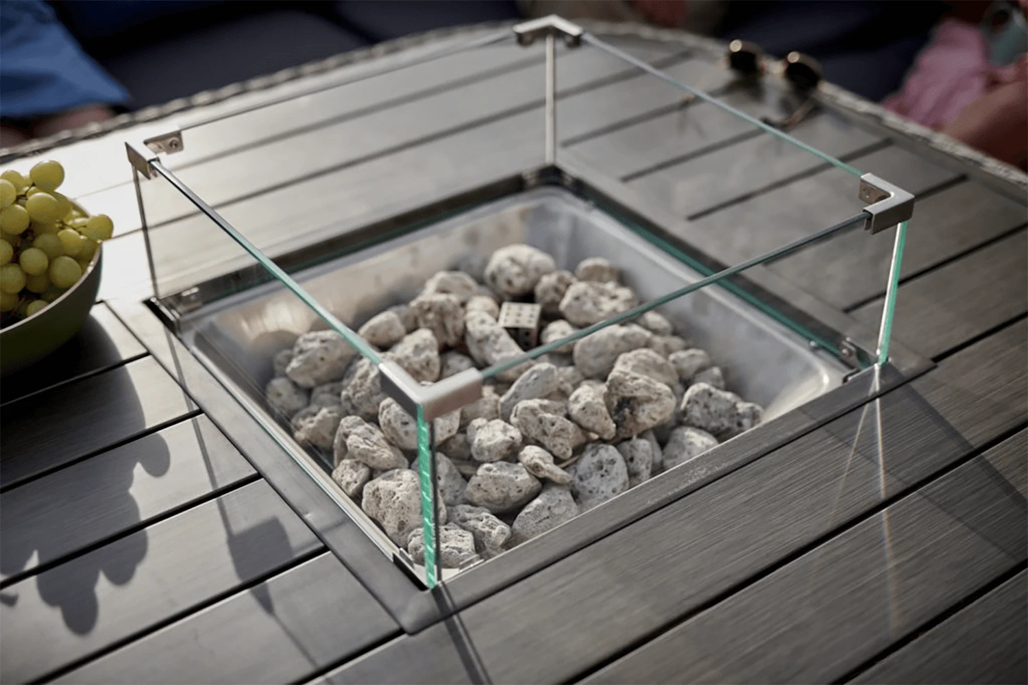 The hand-woven synthetic weave used on this set is weather and UV resistant, meaning it can be left out all year round. The set features an aluminium frame which is rustproof and sturdy, it also has additional reinforcements along the sofa section for added support. The fire pit table also neatly stores the gas canister, keeping your set tidy and functional.