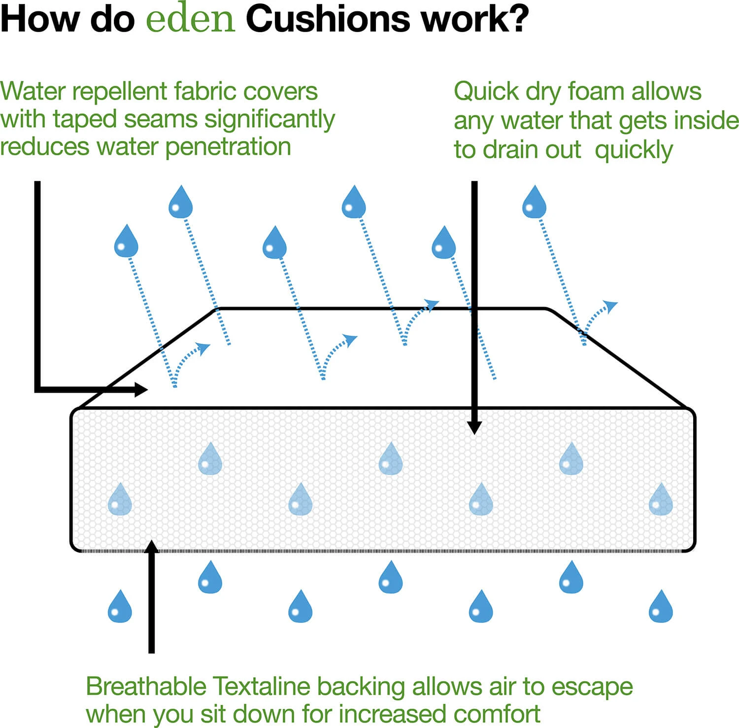 Eden cushions feature fabric covers that are soft to the touch. Special fibre-filled back cushions and textilene backed seat cushions allow air and moisture to escape, and the cushion to give like a normal cushion when you sit down for maximum comfort.
