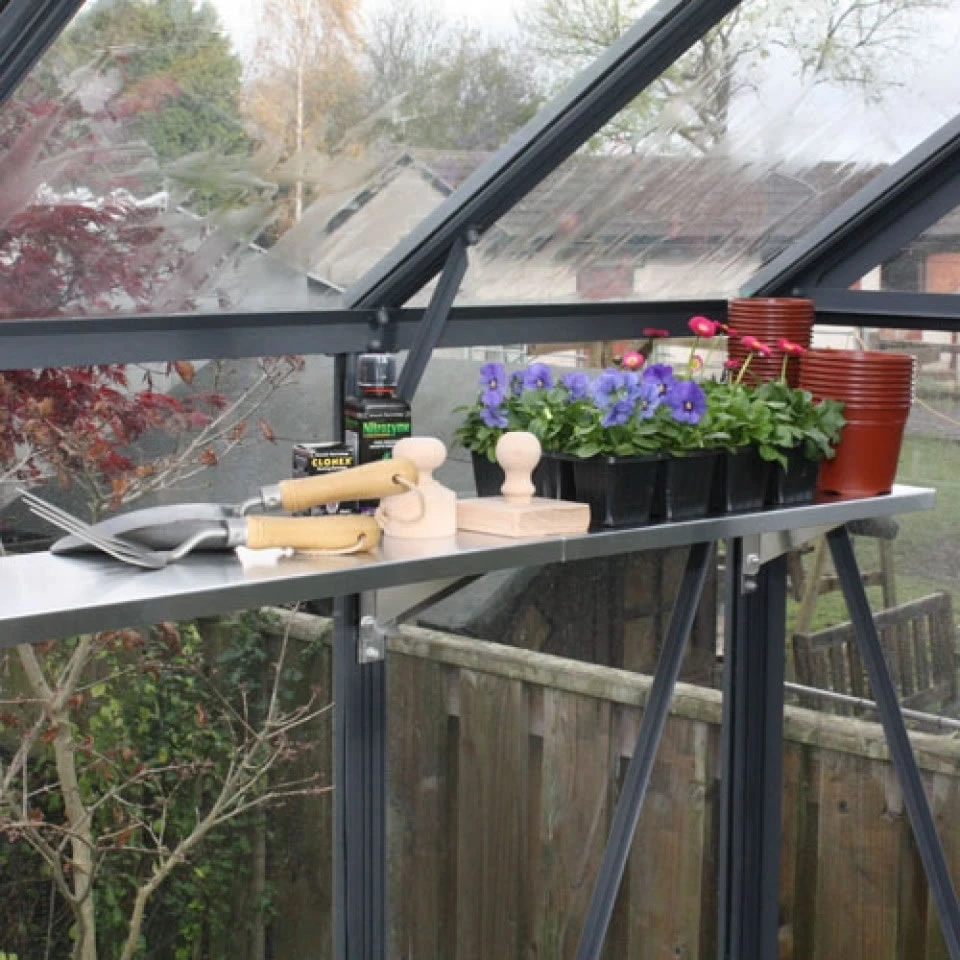 This Modular Greenhouse Shelving is supplied complete with aluminium brackets designed to fit easily into the glazing channels of your greenhouse using the cropped head nuts and bolts supplied. You can also fit this shelving to a wooden greenhouse by substituting the cropped bolts for suitable wood screws (not supplied). One single aluminium tray measuring 61.5 cm x 25 cm is supplied, making it ideal for accommodating seed trays and pots. Supplied flat pack for self-assembly, full instructions supplied
