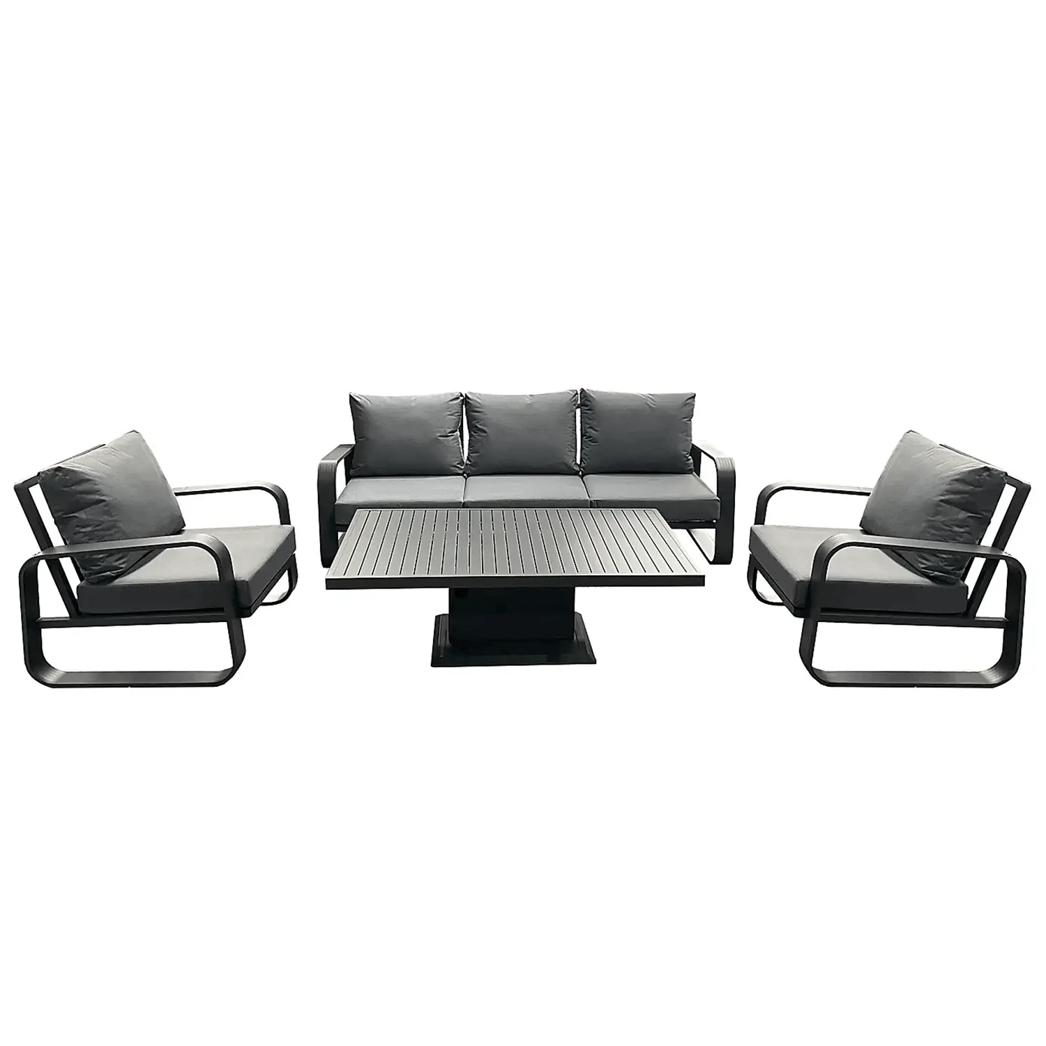Consisting of a 3 seat sofa, 2 lounge chairs and a height adjustable table, this set has flexible options, from low down casual dining, to more formal dining occasions – simply adjust the table as desired.