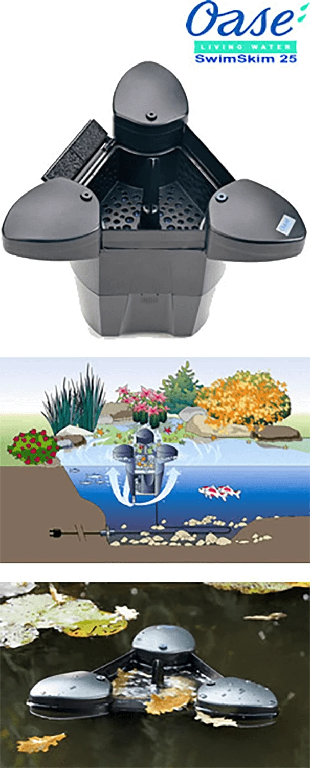 The Oase SwimSkim 25 is a powerful and effective floating pond skimmer which prevents leaves, pollen or other algae nutrients getting into pond water via the surface by pulling this debris into the collection basket.